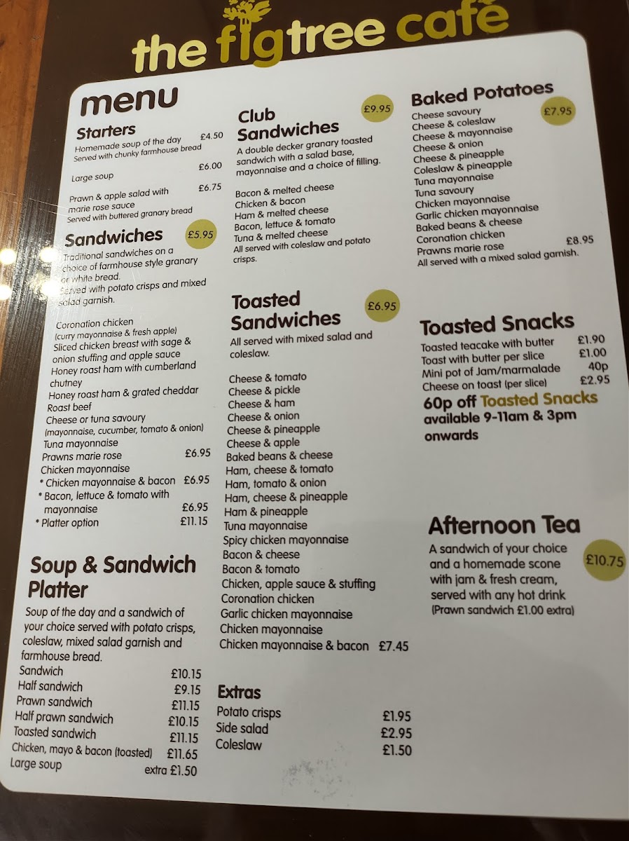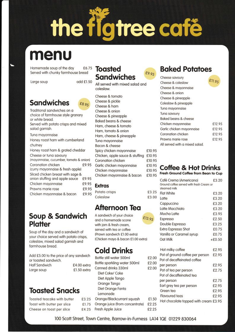 From a reviewer's perspective, the menu at The Fig Tree on 100 Scott St offers a charming blend of classic café favourites and comforting homemade dishes. The Homemade soup of the day sets a warm, inviting tone, while the sandwiches impress with variety-from Tuna mayonnaise and Honey roast ham with Cumberland chutney to the more indulgent Coronation chicken. Toasted options such as Cheese & tomato or Cheese & pineapple provide simple, satisfying bites, and the baked potatoes-topped with choices like Cheese savoury or Cheese & coleslaw-add hearty, customizable options. Lighter snacks, including a Toasted teacake with butter or Cheese on toast per slice, pair perfectly with extras like Potato crisps or Coleslaw. For a more indulgent experience, the Afternoon Tea stands out as a treat. Beverage options are equally thoughtful, from Café Crema (Americano), Flat White, Latte, Cappuccino, and Latte Macchiato to refreshing cold drinks such as Bottle still water 500ml, Bottle sparkling water 500ml, and a range of soft drinks including Diet Coke, Coke, Diet Apple Tango, and Orange Tango. Overall, the menu strikes a careful balance between traditional comfort food and accessible café classics, making it a versatile choice for casual lunches, light snacks, or a relaxing afternoon tea.